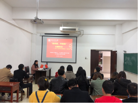 2020年11月6日,为深入学习贯彻习近平总书记关于防范重大风险的系列重要论述,我院2018级硕士研究生党支部、2019级硕士研究生党支部在学院4304教室开展了“防风险、守底线”主题党日活动,活动由2019级硕士研究生党支部书记雷蕾主持,全体党员参加。