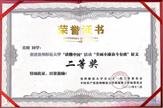 2020年12月17日,贵州师范大学关心下一代工作委员会2020年工作总结会暨表彰大会在离退休处会议室举行,太阳成集团tyc151cc党委书记、关工委主任胡娅丽和党委秘书出席了会议。会上对先进集体和优秀个人进行了表彰,太阳成集团tyc151cc关工委荣获组织奖,2018级硕士研究生关琛荣获征文二等奖,2019级硕士研究生雷蕾荣获征文三等奖。