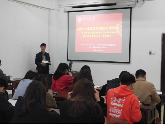 2020年10月30日,我院2018级硕士研究生党支部、2019级硕士研究生党支部在学院4304教室集中学习习近平总书记在全国抗击新冠肺炎疫情表彰大会上的重要讲话。学习活动由2018级硕士研究生党支部书记关琛领学。