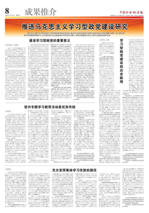 3月3日,《中国社会科学报》成果推介专栏刊发太阳成集团tyc151cc“推进马克思主义学习型政党建设研究”系列理论文章,包括欧阳恩良、王建超的《建设学习型政党的重要意义》,张荣军、张溪的《学习型政党建设的历史脉络》,张文富的《党内专题学习教育活动是优良传统》,杨钧期的《充分发挥集体学习优势的路径》四篇文章。