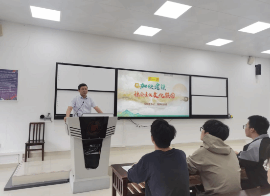 黄其松围绕“强塑国魂担当历史使命”“非凡成就彰显实践伟力”及“坚定自信开启时代华章”三个方面,深入浅出地为同学们解读了为什么要建设社会主义文化强国、怎样建设社会主义文化强国。