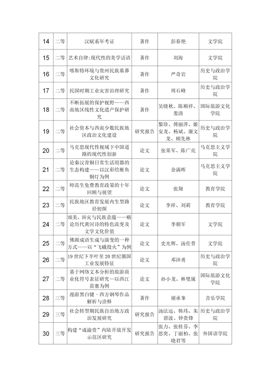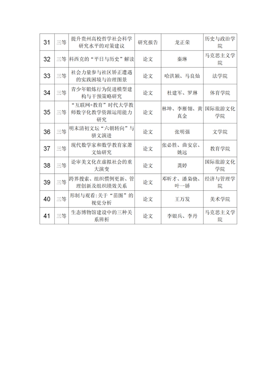 据介绍,在贵州师范大学各学院各单位的积极参与、科研管理部门的精心组织下,贵州师范大学41项成果获奖。其中,著作类13项(一等奖6项、二等奖6项、三等奖1项),调研报告类6项(一等奖2项、二等奖1项、三等奖3项),论文类22项(一等奖4项、二等奖8项、三等奖10项)。全校奖项总数位居全省第一,与第十二次哲学社会科学科研成果奖的31项相比,增长了32%,占贵州省获奖总数的20.5%。